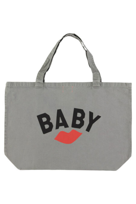 Extra large bag with front and back prints. Detailed with leather logo label.