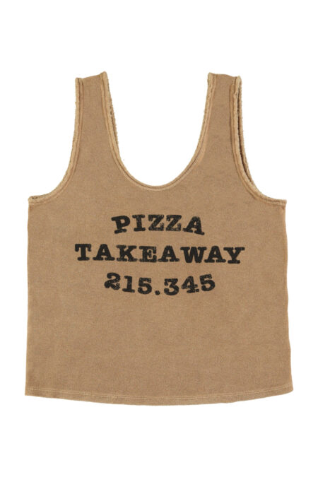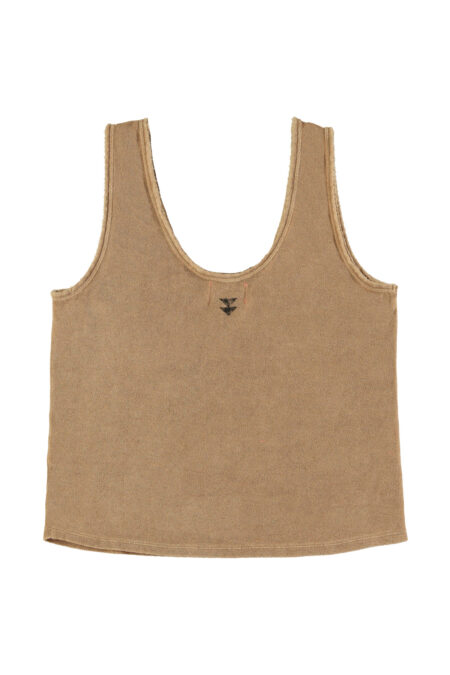 Sleeveless t’shirt in terry cotton with round and ribbed collar. Detailed with front print. Little logo print on the neck.