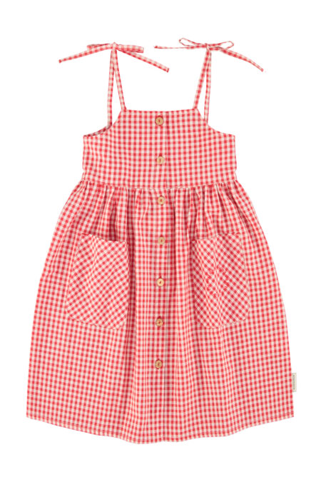 Long dress with thin shoulder tie up straps and patch pockets. Detailed with red logo embroidery in one pocket. Wood buttons on the front.