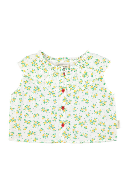 Sleeveless shirt with round crimped collar and front red buttons panel.