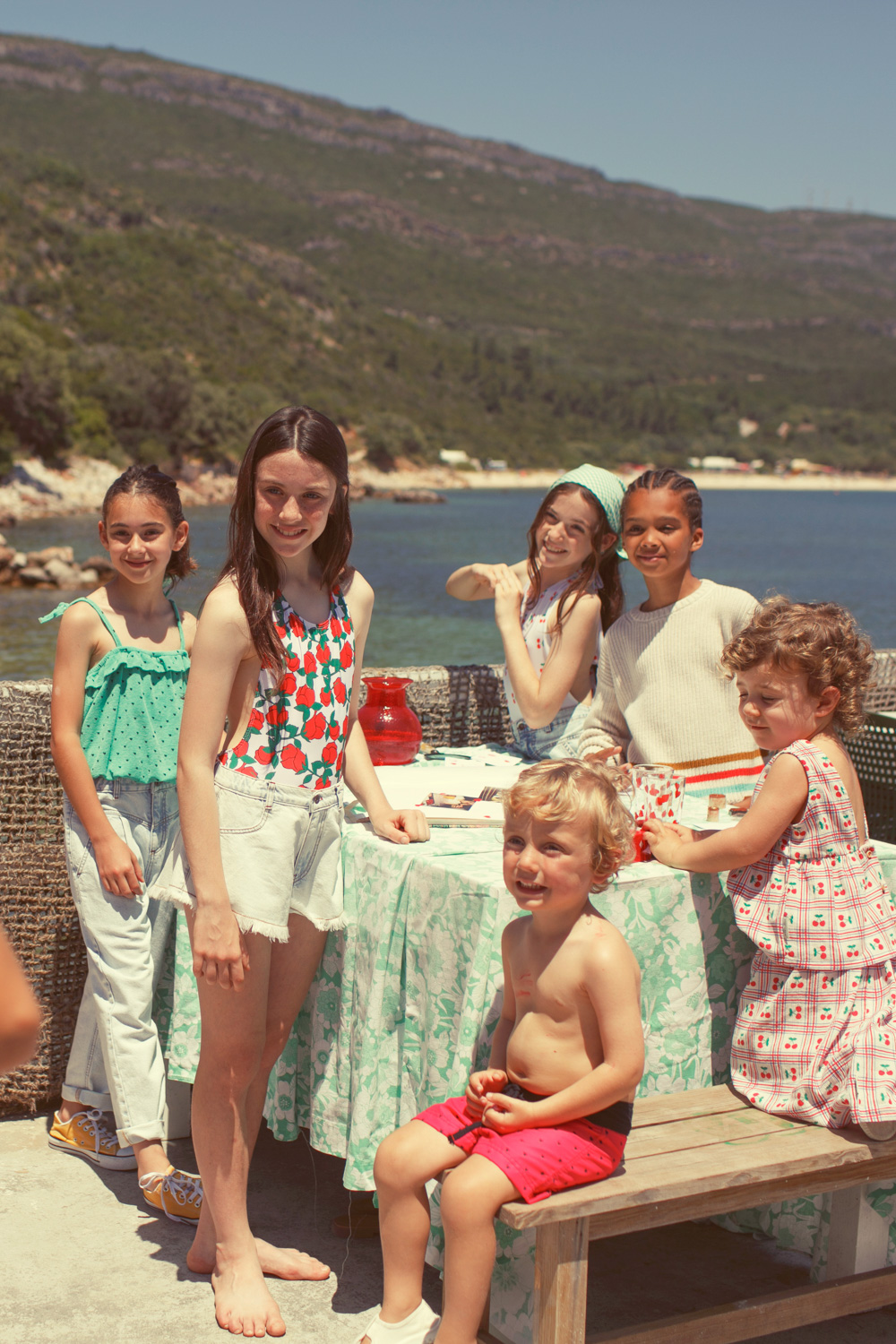 V-neck top with tie up straps and front buttons panel. Loose fit. Detailed with little blue logo embroidered.