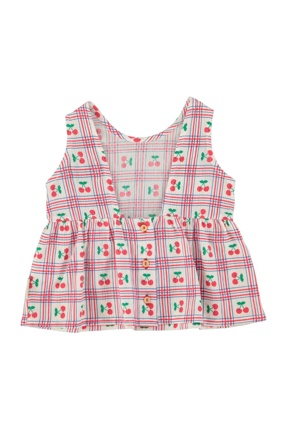 Sleeveless top detailed with square back neckline and wood buttons. Ruffled hem.