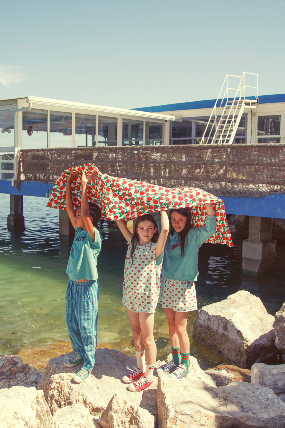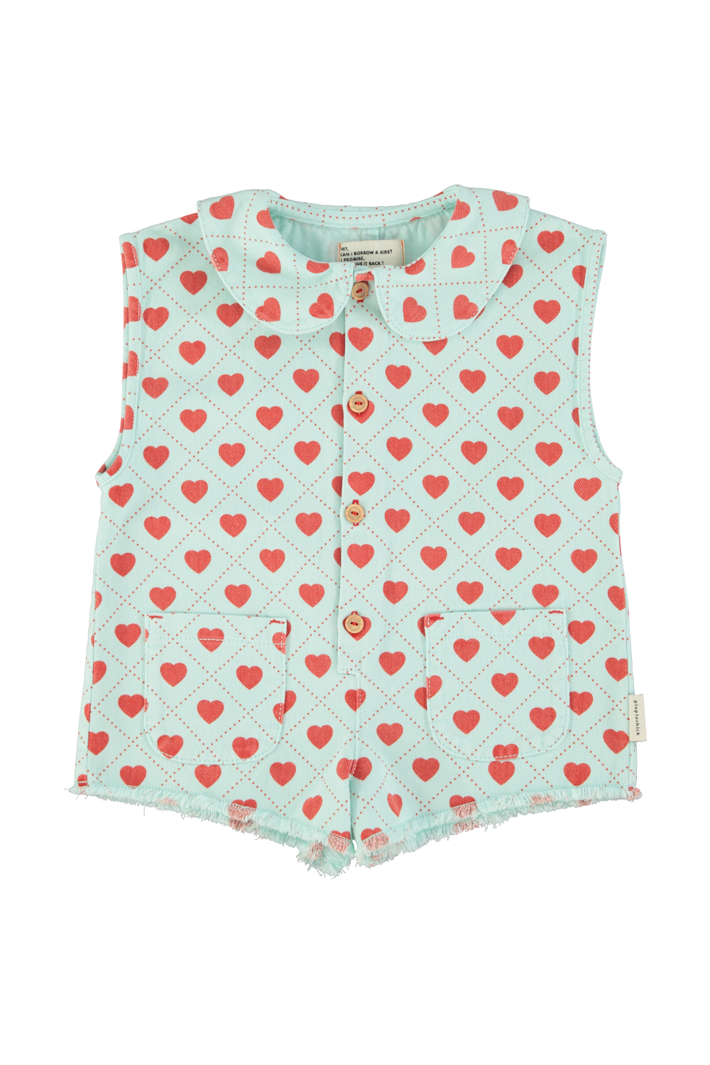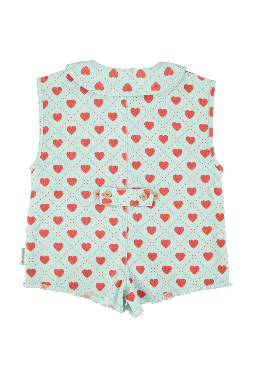short sleeveless jumpsuit | light blue w/ red hearts allover