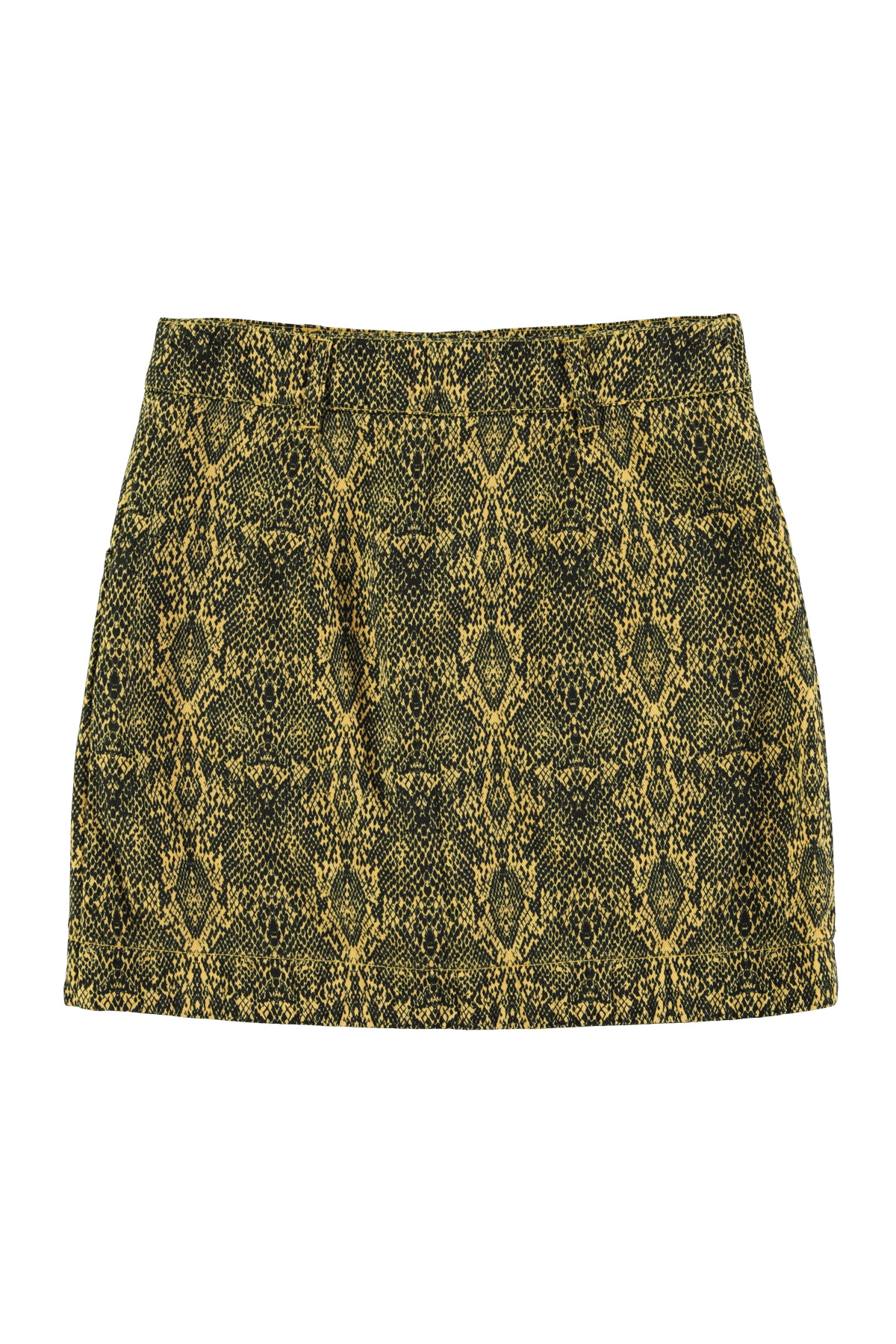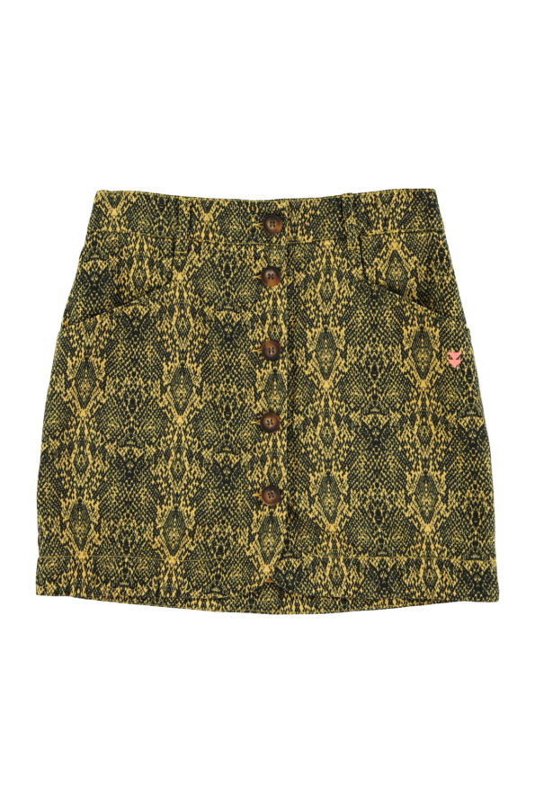 Short skirt with buttons on the front and side pockets. Belt loops.