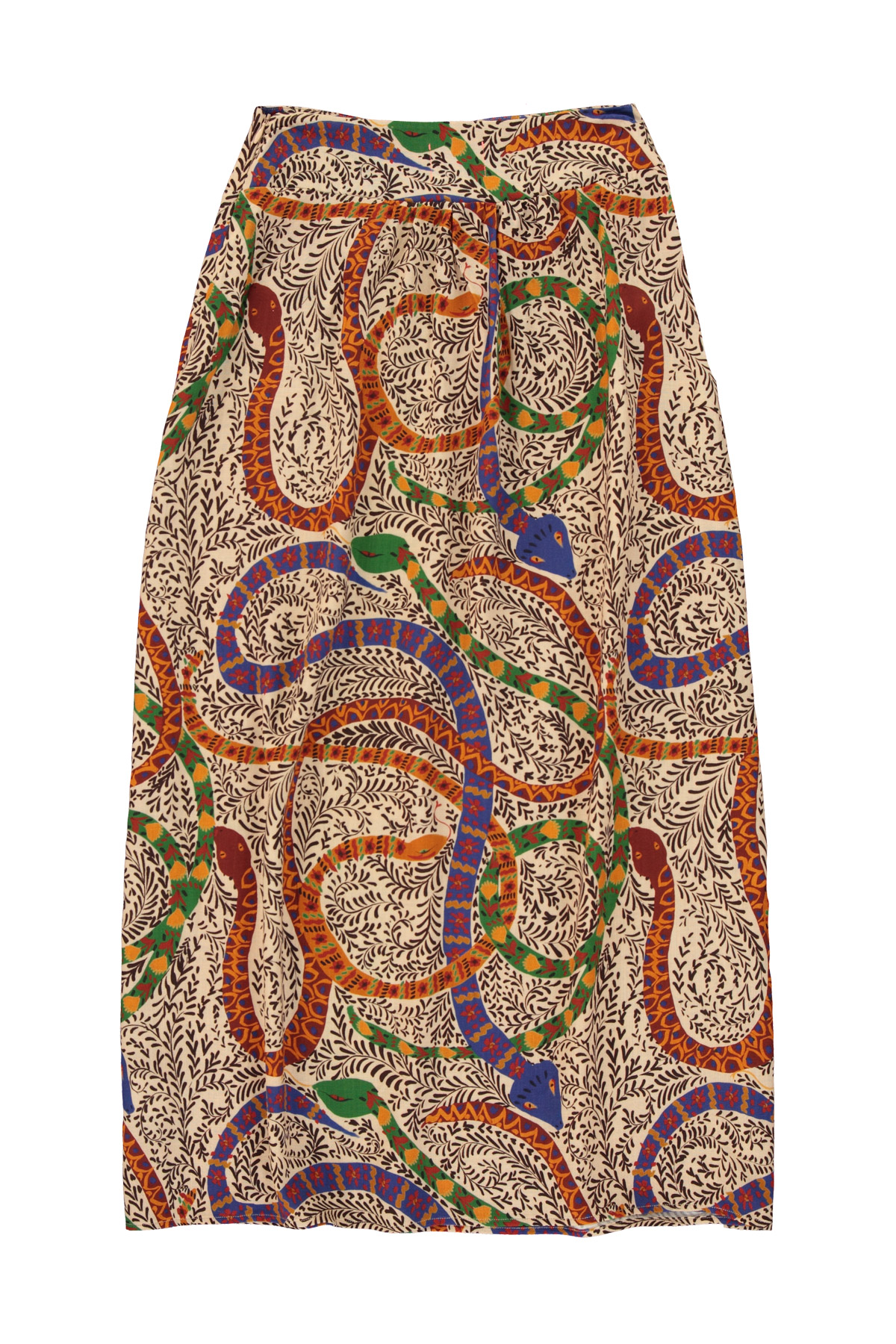 Long skirt with belt loops on the waist. Button fastening on the front. Lateral pockets. Detailed with little logo.