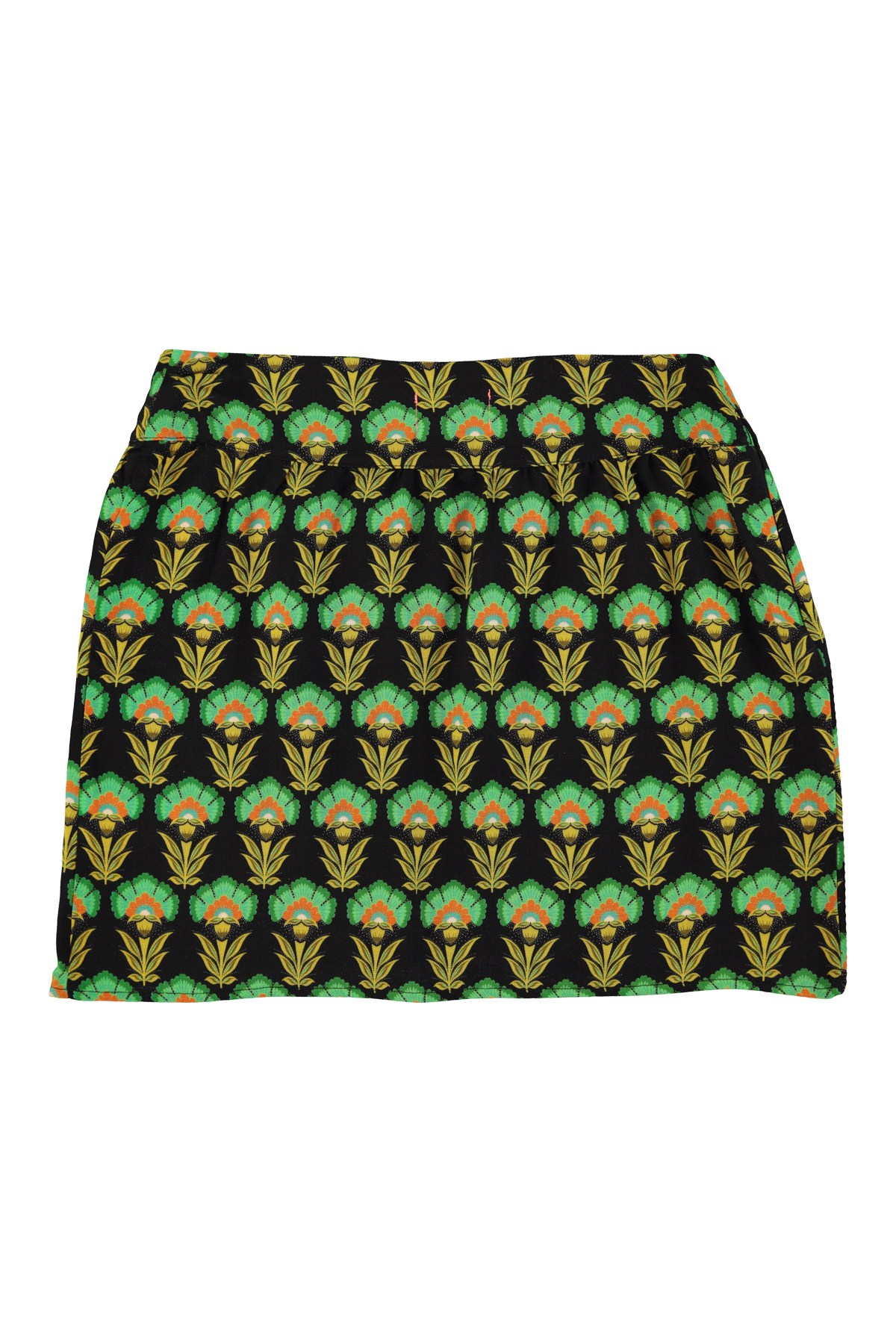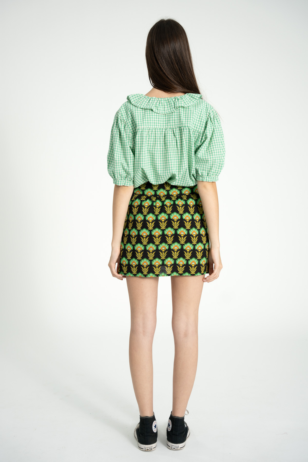 Short asymmetrical skirt with front decorative buttons. Invisible zip fastening.
