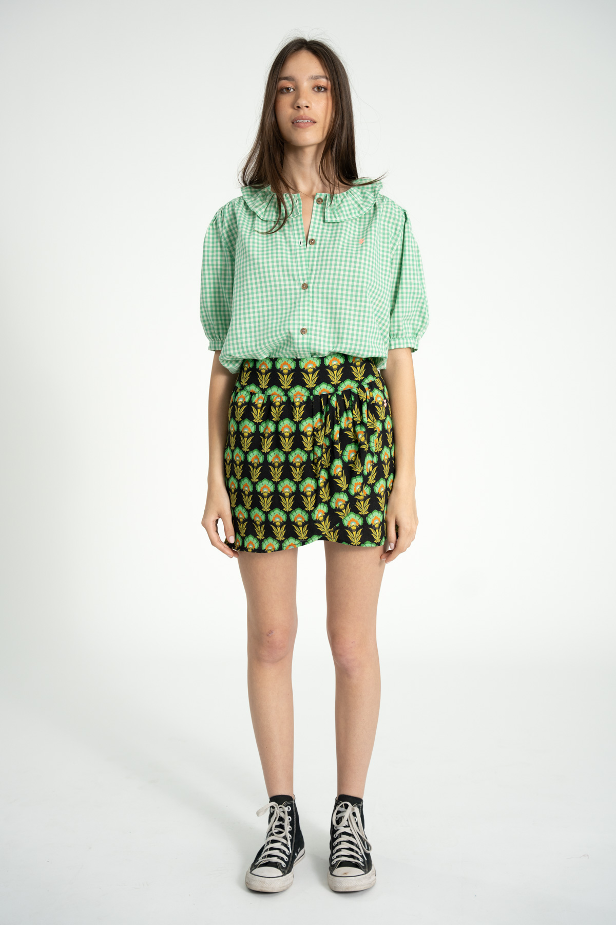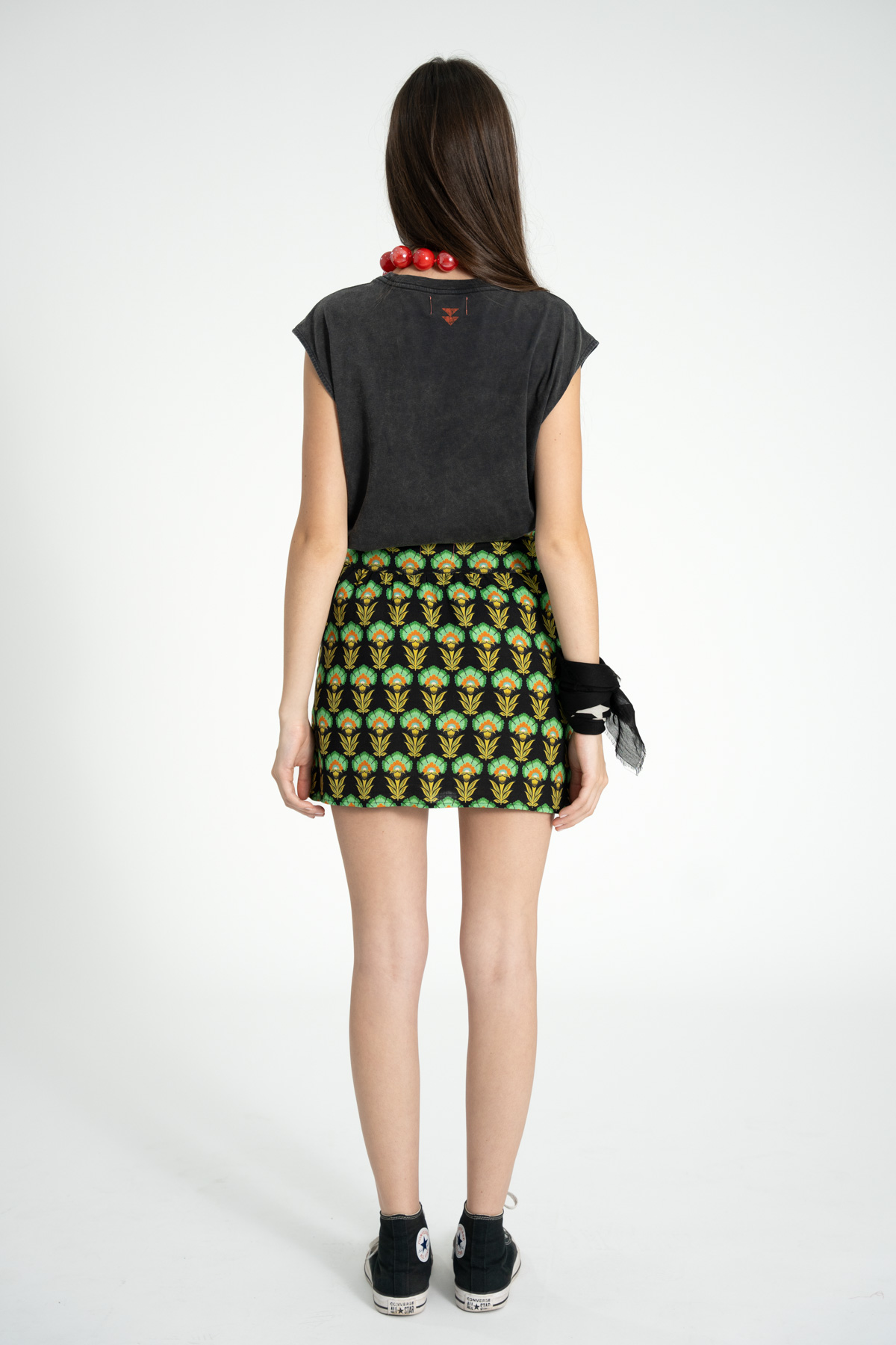 Short skirt with wrap-style and front tweezers. Lateral invisible zip fastening. Detailed with embroidered logo.